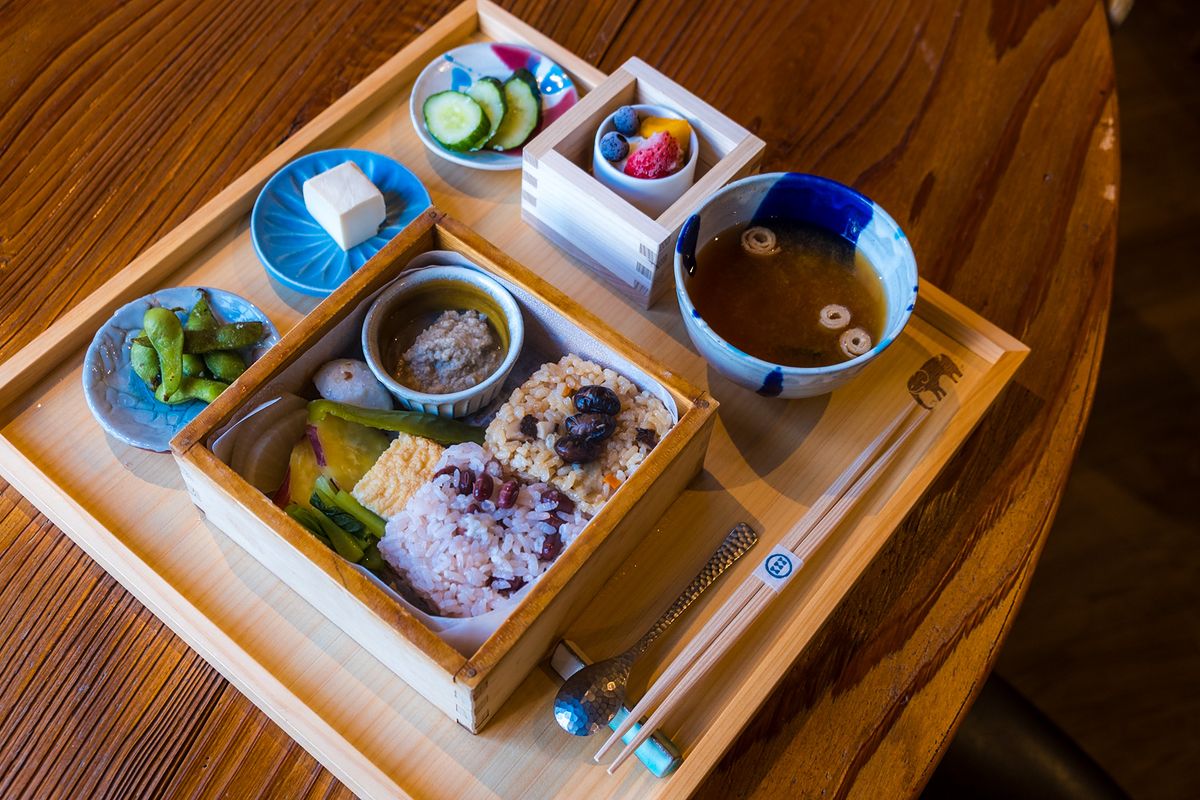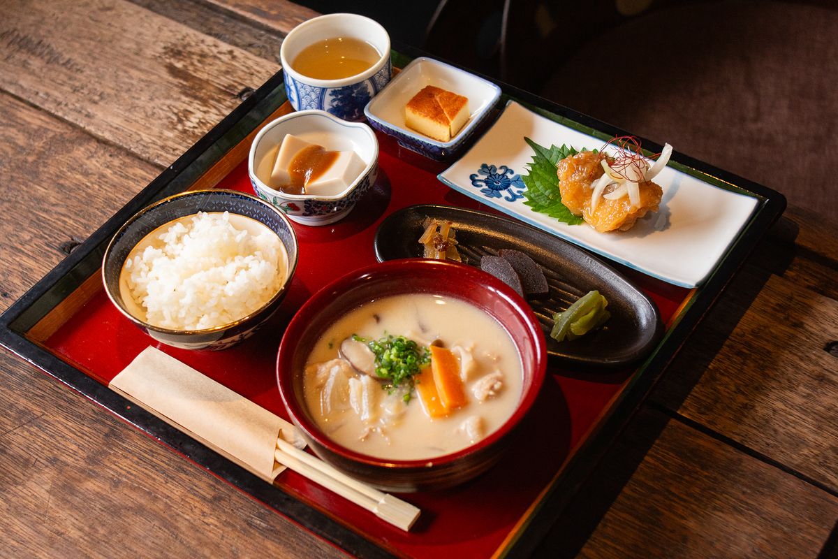 A restaurant located within Koden, a multifunctional complex on the brewery grounds that brings together sake, fermentation, and art, and also offers dining and accommodation. Kotsuzumi Onri - Fermented Makanai Café - is furnished with tools from the original brewery and old sake barrels repurposed as chairs, giving the space a quietly playful, historical feel. The lunch menu centers on fermentation and is reason enough to visit the brewery on its own. Organic local vegetables form the base, with gentle fermentation using sake lees, koji, and house-made miso made from pesticide-free Tamba soybeans. Enjoy a comforting lunch featuring sekihan (red rice), okowa (sticky rice), three daily brewery-style side dishes, and miso soup made with house-made miso balls. Other dishes include Tanba chicken rice topped with a light white meringue and sweet sake tomato sauce, or a sake-lees pizza made with rice-flour dough fermented using sake yeast and brewing water. Served in wooden dishes, the food is prepared with a light touch, letting fermentation support the flavors rather than define them.