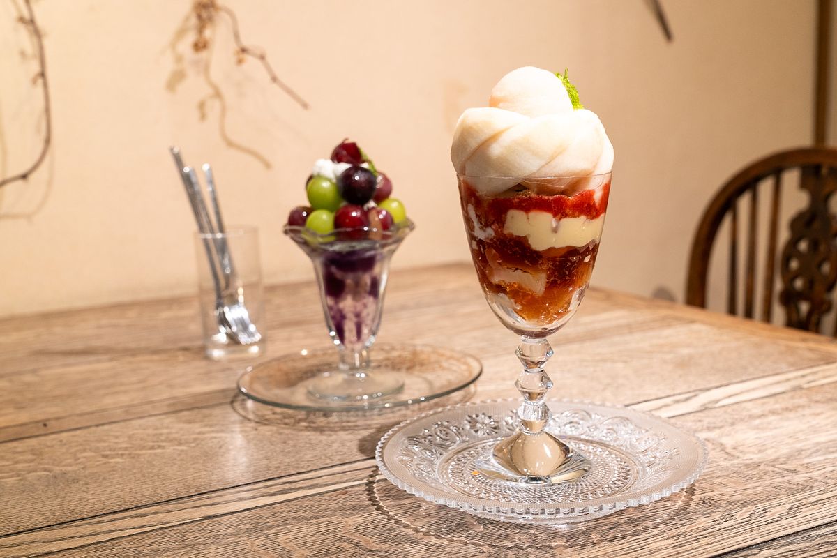 The menu always features various selections of peak-seasonal fruits, and even in winter, the café’s fruit parfaits remain a local favorite. One standout offering is New Pione Parfait, made with generous amounts of New Pione grapes—an Okayama specialty known for its deep sweetness and well-balanced acidity.