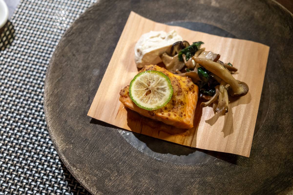 In keeping with NIPPONIA’s meticulous attention to detail, dining here seeks to elevate the richness of the Tajima area in northern Hyogo Prefecture, where Sasayama is located, offering a distinctive fusion of French, Japanese, and local Sasayama cuisine that is light, flavorful, and international. There is a careful attentiveness to texture and temperature as well: trout cooked on a cedar plank carries a subtle hint of cedar smoke baked into the fish and is paired with local chestnut and mustard, while the chilled smoothness of a French-style liver dish with a shira-ae foam topping gives way to the warm, savory comfort of a soup made from butternut squash fermented with rice koji. Even the dessert reflects the surroundings, with a classic opera cake reimagined through the use of chocolate, hojicha, caramel, and persimmon.