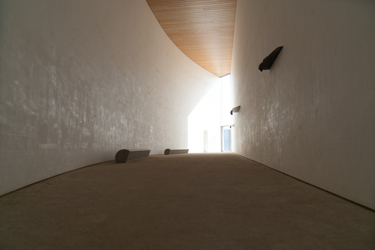 The stark crescent-shaped Moon gallery features Kazuo Okazaki’s HISASHI-THAT WHICH SUPPLEMENTS. This space is inspired by sheltering eaves, a peaceful place to sit and rest. Two long stone benches positioned along the curved wall, provide a spot for visitors to rest their mind and body. Close your eyes, and the installation becomes an auditory experience, where every movement is amplified. The ground is rough, and the room echoes with the sounds of people moving around. Moon’s flat wall points in the direction of 10pm during the harvest moon.
