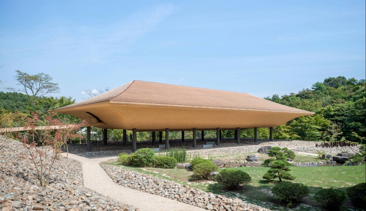 Atop a hill behind the Shodo stands the otherworldly Kohtei. Designed by sculptor Kohei Nawa (1975–) and his creative platform Sandwich, the Kohtei functions as both an impressive piece of architecture and an art installation. Seeming to rise from the ground, it is a ship-shaped building on pylons over a sea of scattered rocks, creating the impression of a vessel ready to set sail. It is constructed of solid concrete, with an exterior covered by nearly 590,000 sawara cypress planks that reflect light, giving it a gentle silhouette. The dark interior houses the installation; the resulting sensory experience is designed to represent the immensity of the ocean and encourage a meditative outlook.