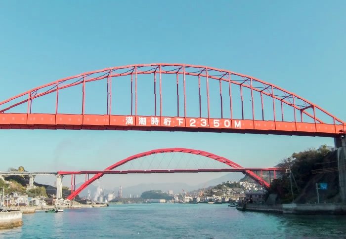 Soon after departing Kure, the ship passes through the Ondo Strait. Construction of this narrow passage between Honshu and Kurahashijima Island is believed to have been ordered by the powerful military leader Taira no Kiyomori (1118–1181). Two red arch bridges span the strait; flowering cherry and azalea trees bloom along the shores in spring. Continuing eastward, the Sea Spica goes past Chigirishima, an island almost entirely occupied by a lead smelter and refinery. Its unique industrial appearance has earned Chigirishima the nickname “Battleship Island.”