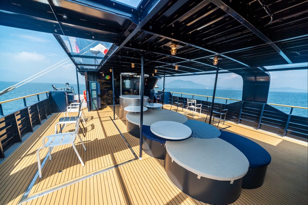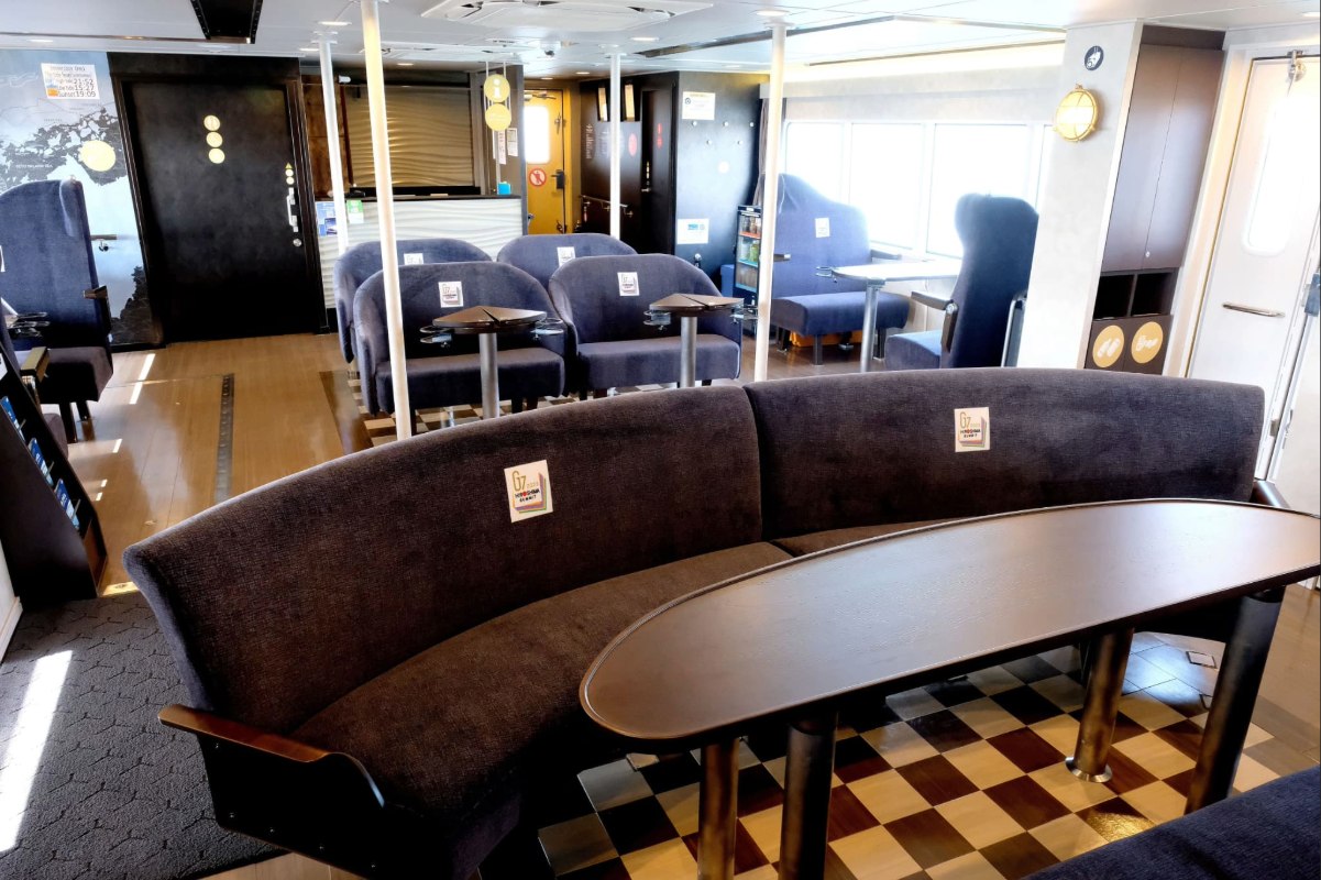 The plaques affixed to certain tables and seats inside the ship were installed to commemorate a special sunset cruise held on the Sea Spica for the world leaders attending the 2023 G7 Summit in Hiroshima.