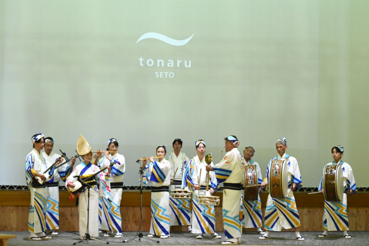 This inclusive, communal spirit continues at tonaru SETO. After the performance, audience members are taught the steps of the dance and encouraged to take to the stage and join in. The men’s dance involves making expressive hand movements while bending at the knees and pointing the feet outward. The female dancers, balancing on the fronts of their wooden sandals, wave their hands above their heads while moving straight forward. In general, men dance freestyle, while women perform in tightly synchronized groups.