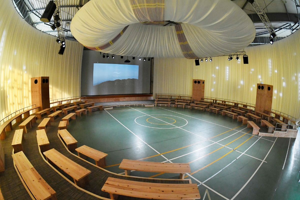 Awa Odori performances at tonaru SETO are held in the former Seto Elementary School gymnasium. The building’s interior has been transformed into a unique circular space, with the original gym floor serving as the stage. Elevated bench seating surrounds this central performance space, so audience members can view the dancers from multiple angles as they move.
