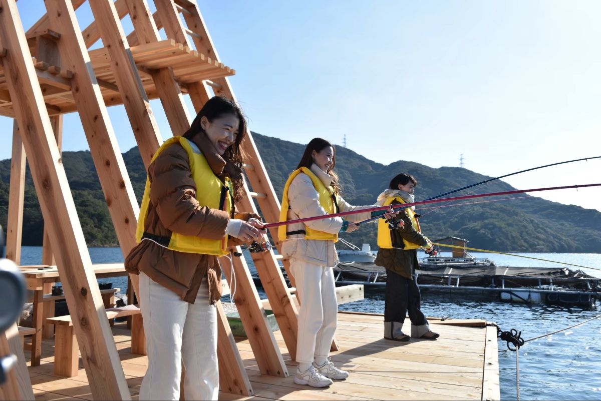 In addition to its Awa Odori performances, tonaru SETO offers half- and full-day fishing experiences. These take place on anchored wooden rafts in the nearby Uchinoumi Sea, an enclosed bay known for its calm waters. The excursions include fishing equipment and an instructor, so participants can show up empty-handed and need no prior experience. Instructors provide guidance on fishing techniques, and later on preparing and cooking the catch. This is done directly onboard the raft, so participants can enjoy the fish fresh out of the ocean. Fish commonly caught include olive flounder, horse mackerel, and sea bream.