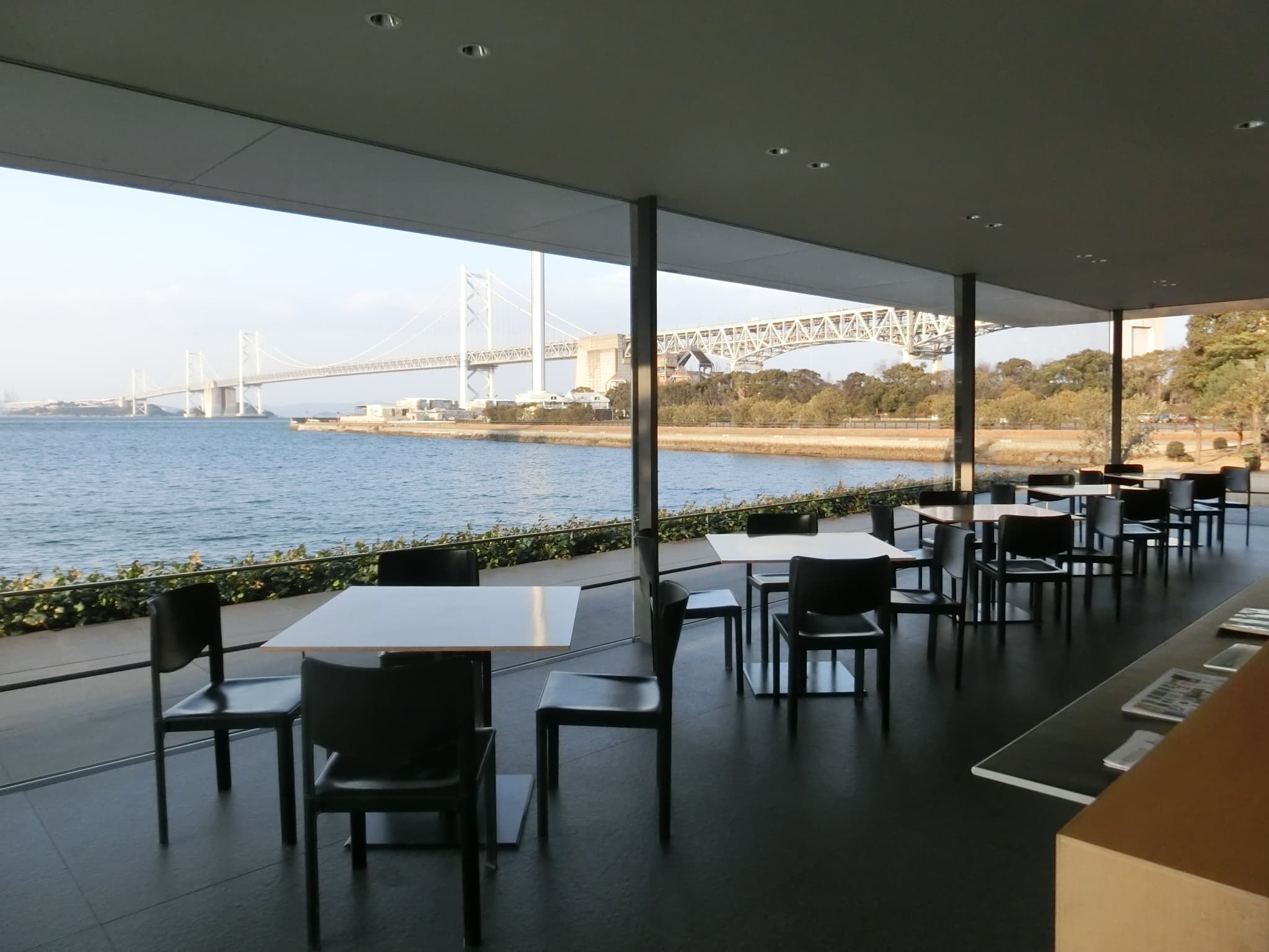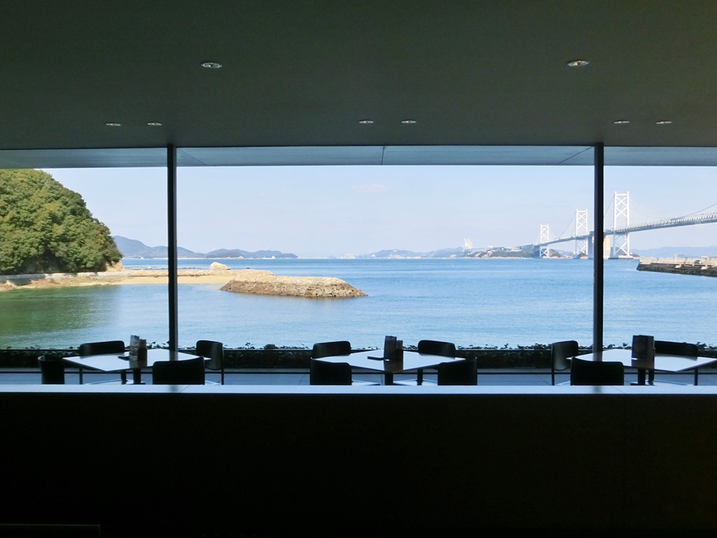 The ground-floor café is open to the general public and offers local Japanese sweets (wagashi). Parking is convenient and free of charge. This comfortable atmosphere is cherished by locals enjoying tea on weekdays, families on weekends, and tourists on bus tours to visit larger museums including the Ohara Museum of Art and the Otsuka Museum of Art. Most of all, this friendly café offers the luxury of relaxing with a splendid view of Hitsuishijima and the Seto Ohashi Bridge in the Seto Inland Sea, where Kaii’s grandfather was born and raised.